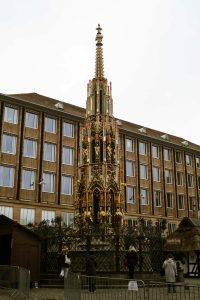 Important to know: The fountain you see today is a historically accurate copy. The original is protected for conservation reasons. The gilded ring grille is particularly well known. One of the rings can be turned – a Nuremberg tradition says that this brings good luck.
